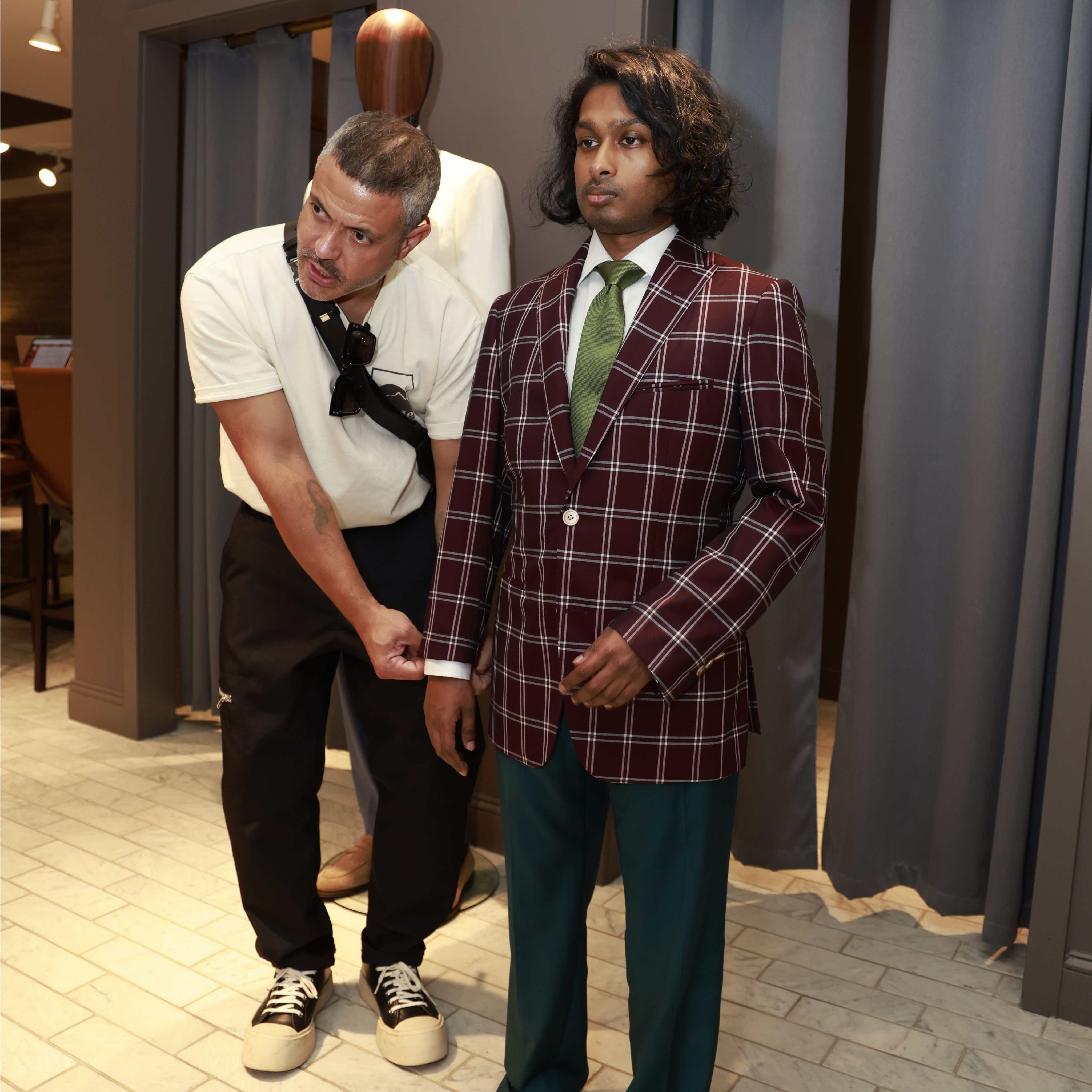 Ashwin Gane poses at the Rainbow Room during New York Fashion Week 2025 wearing a custom Hive & Colony bespoke burgundy plaid suit styled by Christopher Campbell.